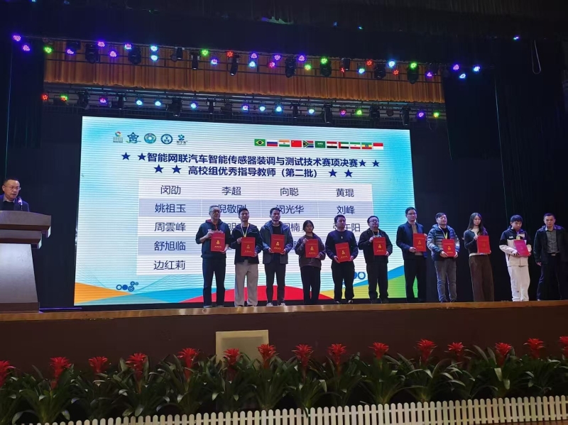 11月26日至29日,2025一带一路暨金砖国家技能发展与技术创新大赛之智能网联汽车智能传感器装调与测试技术赛项全国总决赛,在湖南省吉首市湘西民族职业技术学院举行。我校汽车工程学院共组织3支队伍参加预赛,由舒旭临、杜琼两位老师指导的,新能源汽车检测与维修技术专业2505班吴连杰、周世鸿两位同学组成的2队成功突围到全国总决赛,并在总决赛中发挥出色,获得一等奖的好成绩。两位指导教师获评优秀指导教师,我校同时获评最佳组织奖。